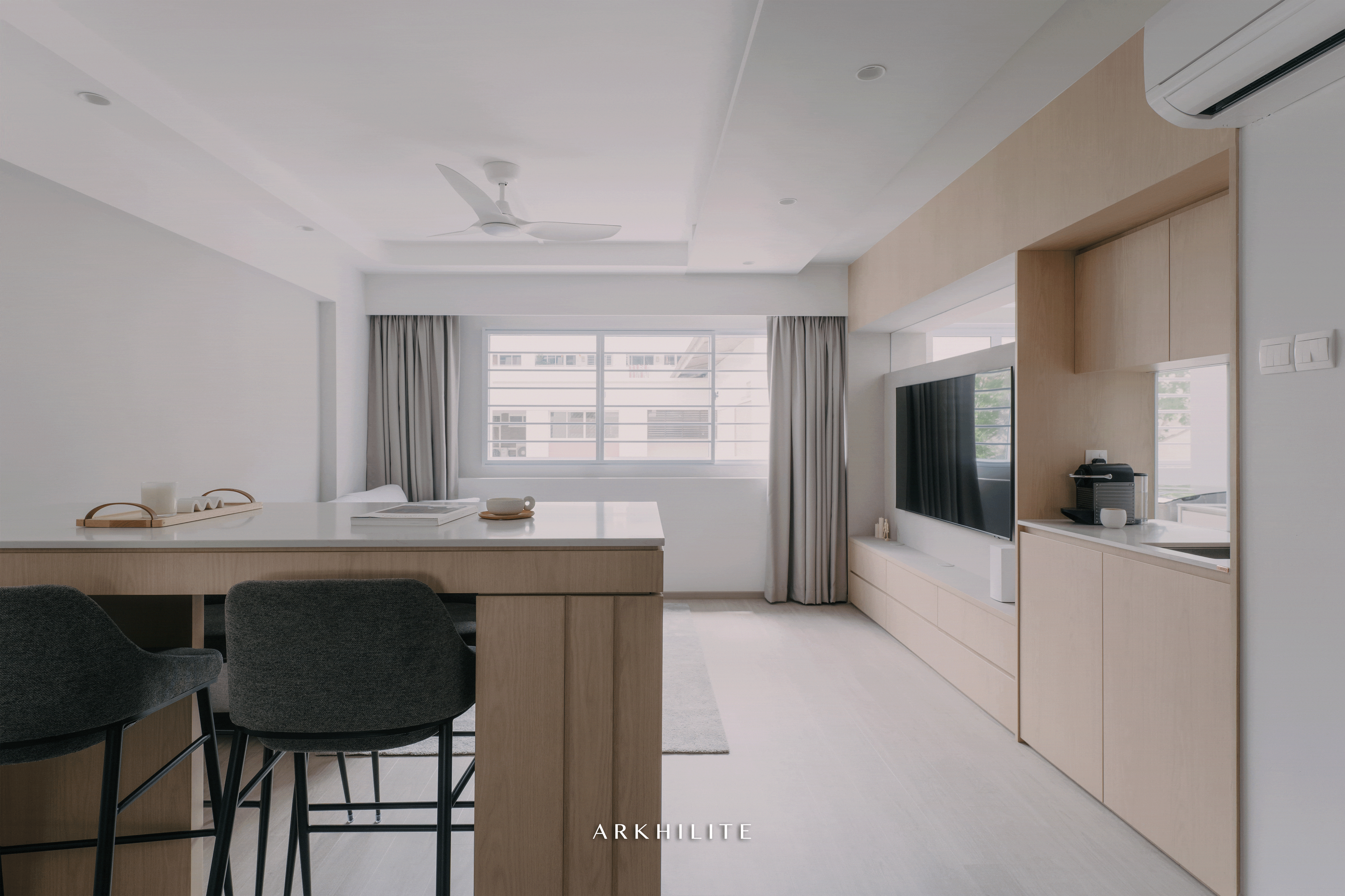 At the Living, when the curtains are drawn back, they parked neatly by the 2 sides of the lounge sofa-bed. When the need arises for the space to be converted into a sleeping area, the curtains can be readily closed from the 2 sides to form an enclosed zone within the Living. A room within a room is created. One can still access the outdoor balcony without entering into the newly converted room.
