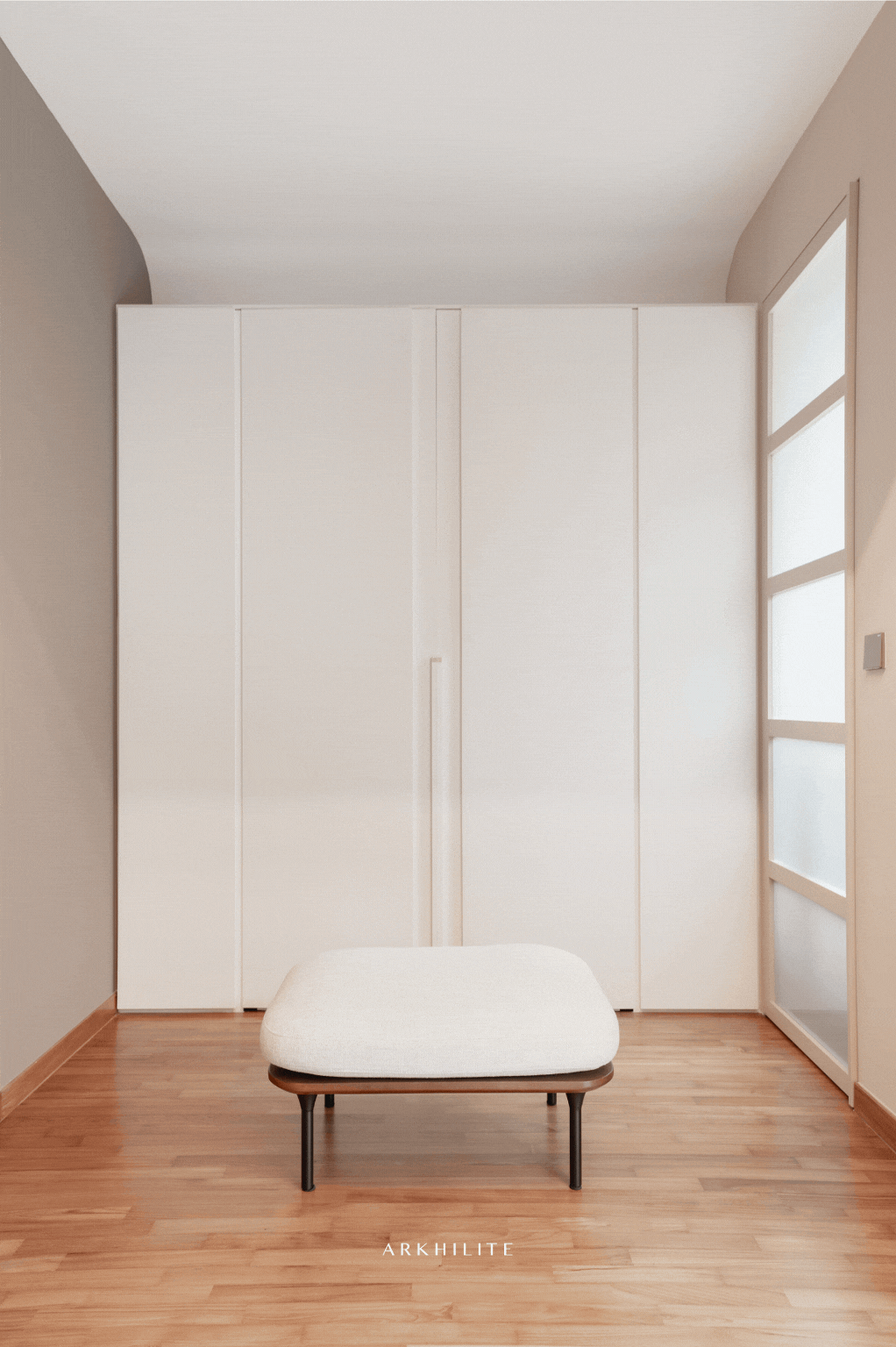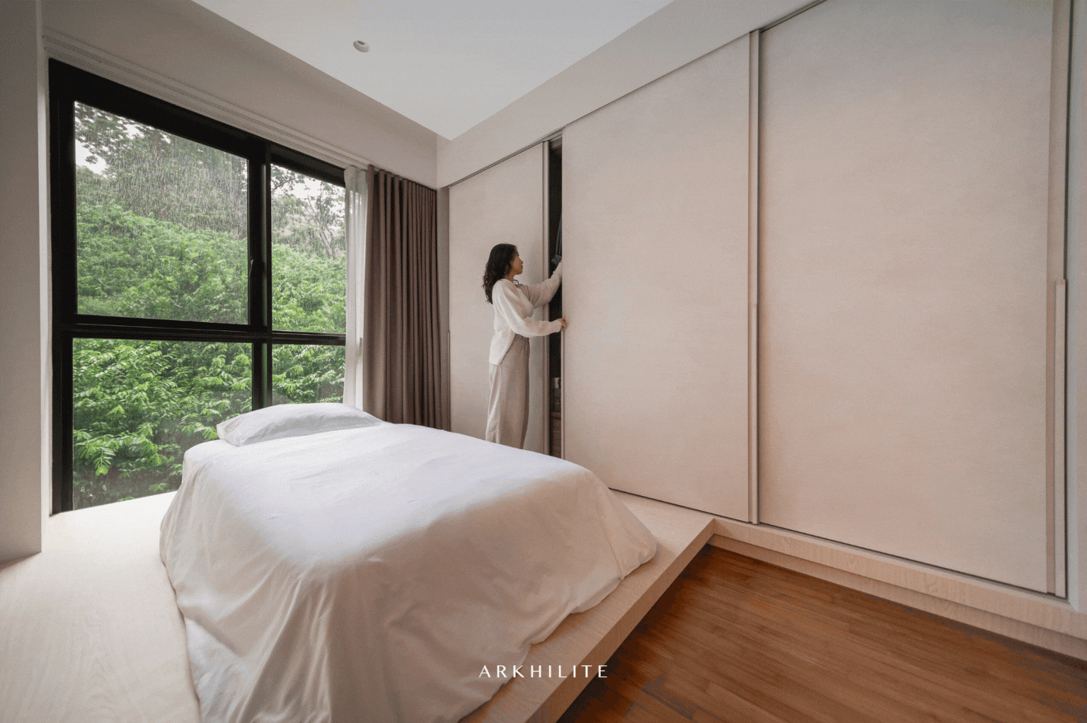 In response to that, we designed the sleeping area on a low timber platform and detailed a full height open storage area for wardrobe and other storage uses. In place of typical wardrobe doors, we designed fabrics which can be drawn to cover up the storage area. The same fabric is also used as curtain for the windows opposite storage area. When closed, the full height fabrics soften the look of the bedroom as they hide the windows and the storage shelves. During daytime, the bedroom feels lofty as natural daylight filters in gently. At night, the bedroom exudes a chic and intimate ambiance, which the clients appreciate.