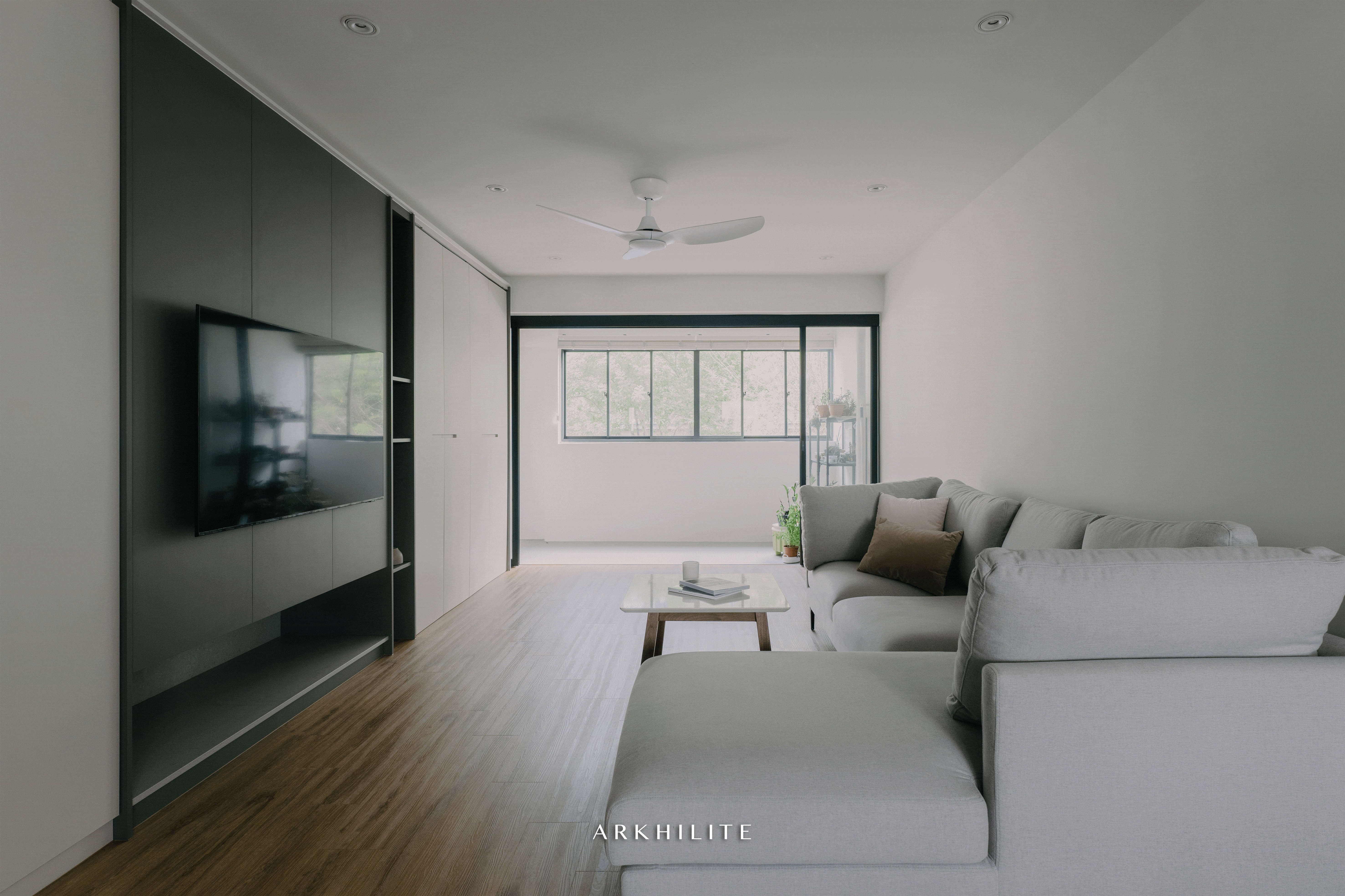 At the Living, when the curtains are drawn back, they parked neatly by the 2 sides of the lounge sofa-bed. When the need arises for the space to be converted into a sleeping area, the curtains can be readily closed from the 2 sides to form an enclosed zone within the Living. A room within a room is created. One can still access the outdoor balcony without entering into the newly converted room.