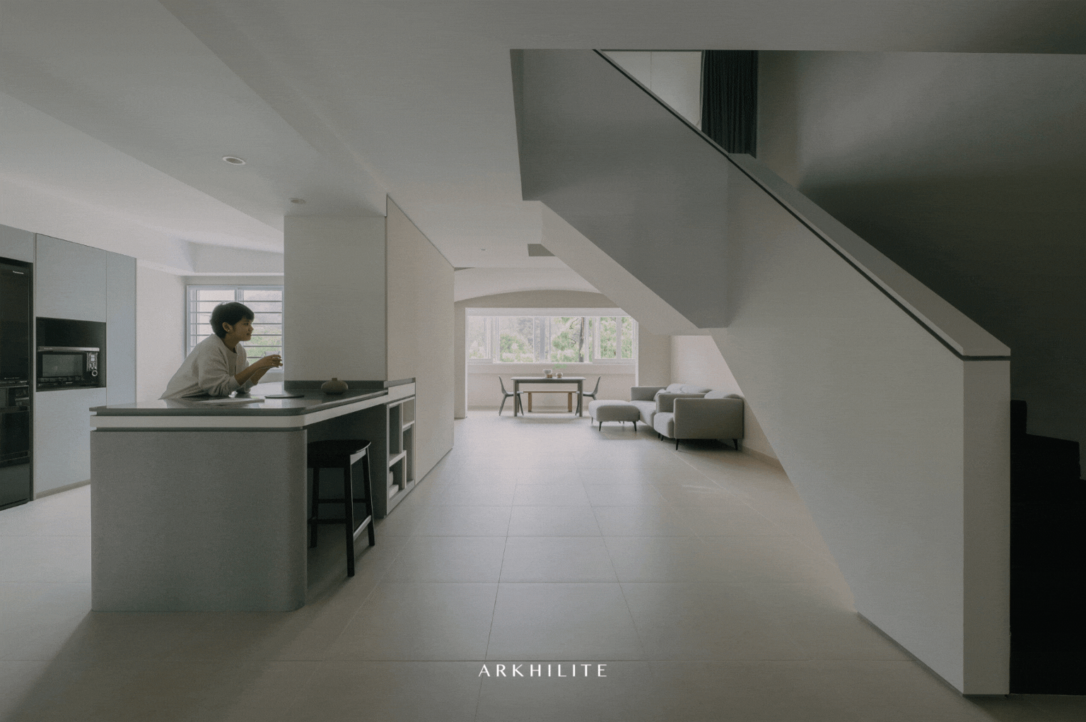 The apartment in downtown Singapore, which belongs to a young couple, is very small in area. To maximize space, the public arena which consists of the Kitchen, Dining and Living, is in one open continuous space. This space leads further to an outdoor balcony. The private spaces of a bedroom, a utility room and a bathroom are tucked away.